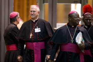 Archbishop Joseph E. Kurtz of Louisville, Ky., second from left, leaves a meeting of the Synod of Bishops on the new evangelization at the Vatican Oct. 10. (CNS photo/Paul Haring) (Oct. 10, 2012) See SYNOD-WILLIAMS Oct. 10, 2012.
