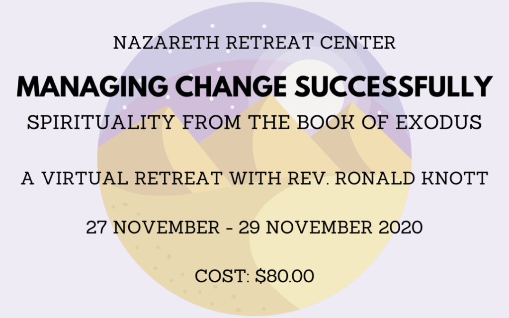 Join Nazareth Retreat Center and Rev. Knott for a virtual, Zoom retreat during the first weekend of Advent. Over four sessions, Fr. Knott will lead prayer, provide short reflections inspired by the Book of Exodus on how to accept and manage change, and facilitate lively discussion. This will be a great opportunity for anyone that has ever struggled with change, like those that have occurred as a result of the coronavirus pandemic, or those who are looking for a way to have a fruitful Advent season during a time when observing it as usual may not be possible. This retreat will be limited to a 25 person maximum to ensure that everyone has an opportunity to participate in discussions.