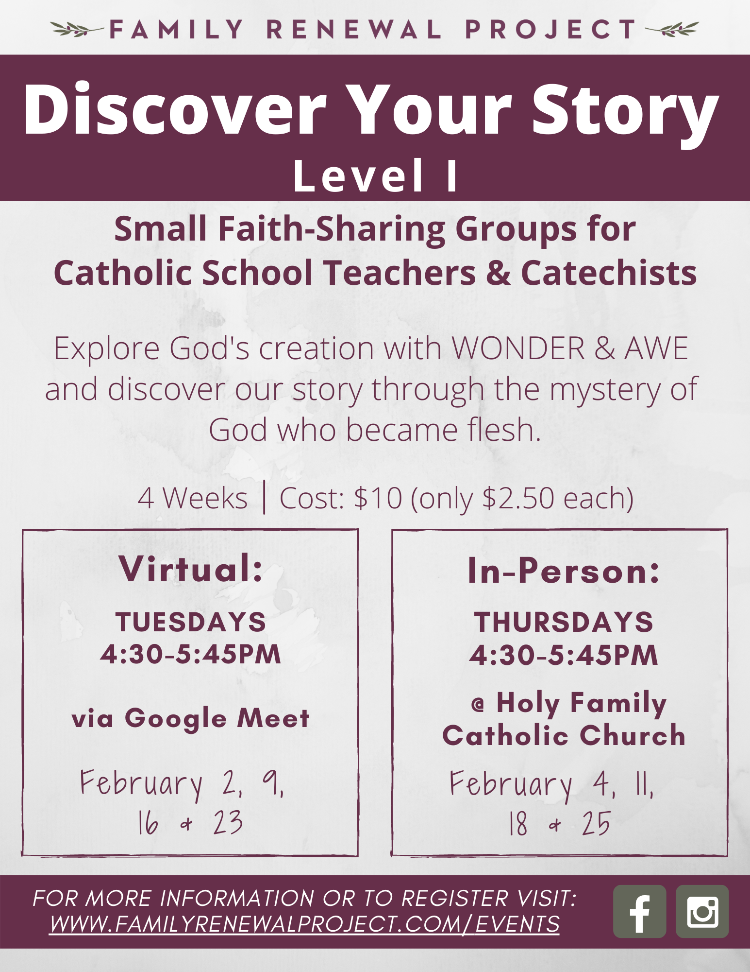 Catechist credit is available to teachers and catechists of the Archdiocese of Louisville. Once you complete the sessions FRP will send verification of attendance to the archdiocesan Office of Faith Formation. You will need to complete an evaluation form and email it to ff@archlou.org.