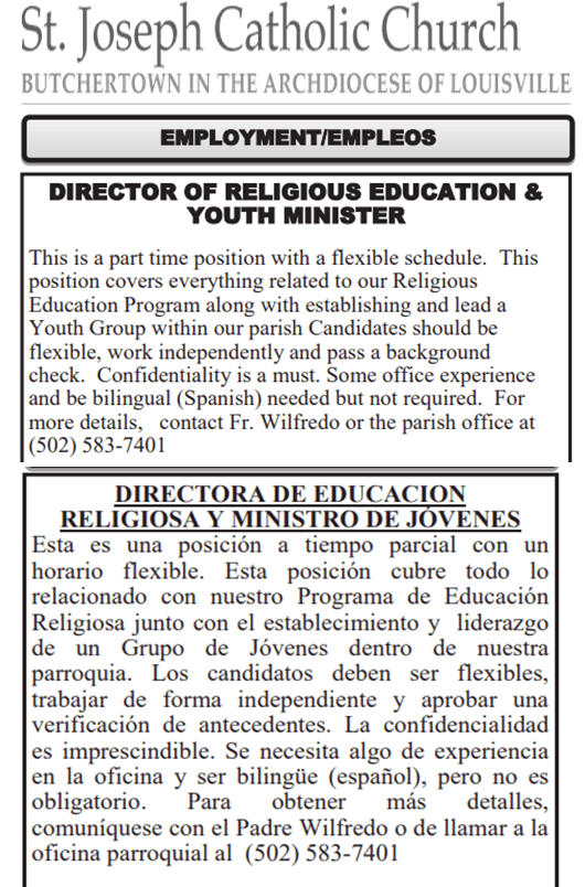 | Qualifications: | • Must be an active practicing Catholic, familiar with parish activities and having previous experience working in a Catholic parish setting. • A bachelor’s degree in related field. • Working toward Catechist certification and ongoing formation opportunities. • Previous experience working in a parish setting desired. • Welcoming personality with strong pastoral and communication skills, open to building relationships in a diverse community. • Ability to learn and navigate current technology and use of social media platforms. |