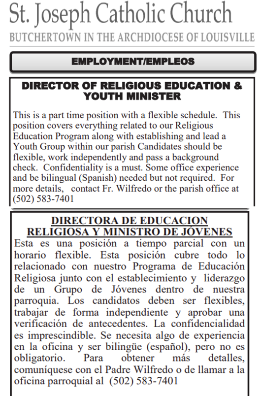 | Qualifications: | • Must be an active practicing Catholic, familiar with parish activities and having previous experience working in a Catholic parish setting. • A bachelor’s degree in related field. • Working toward Catechist certification and ongoing formation opportunities. • Previous experience working in a parish setting desired. • Welcoming personality with strong pastoral and communication skills, open to building relationships in a diverse community. • Ability to learn and navigate current technology and use of social media platforms. |