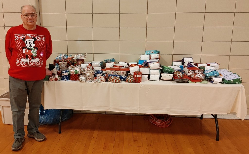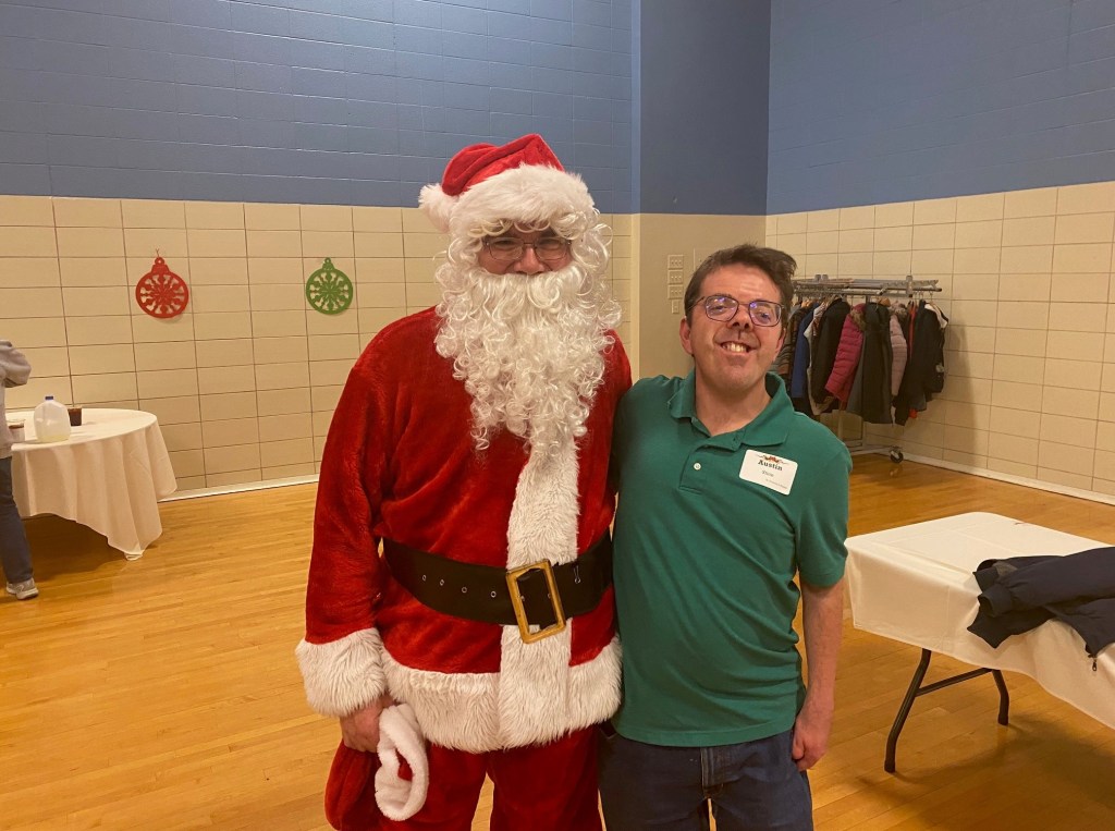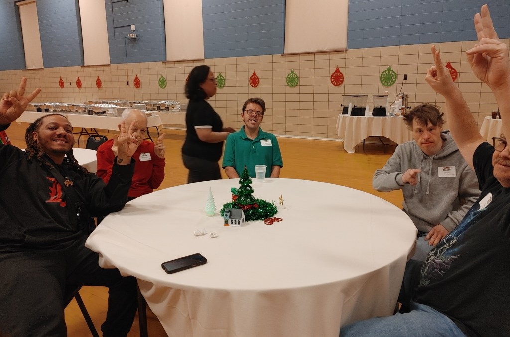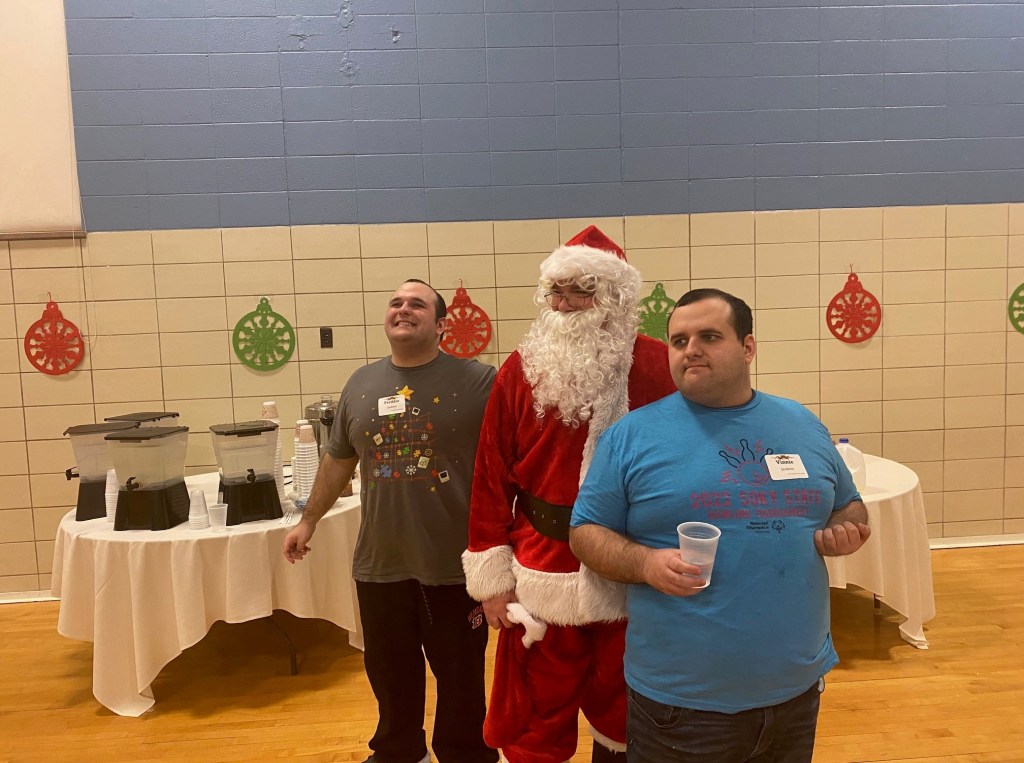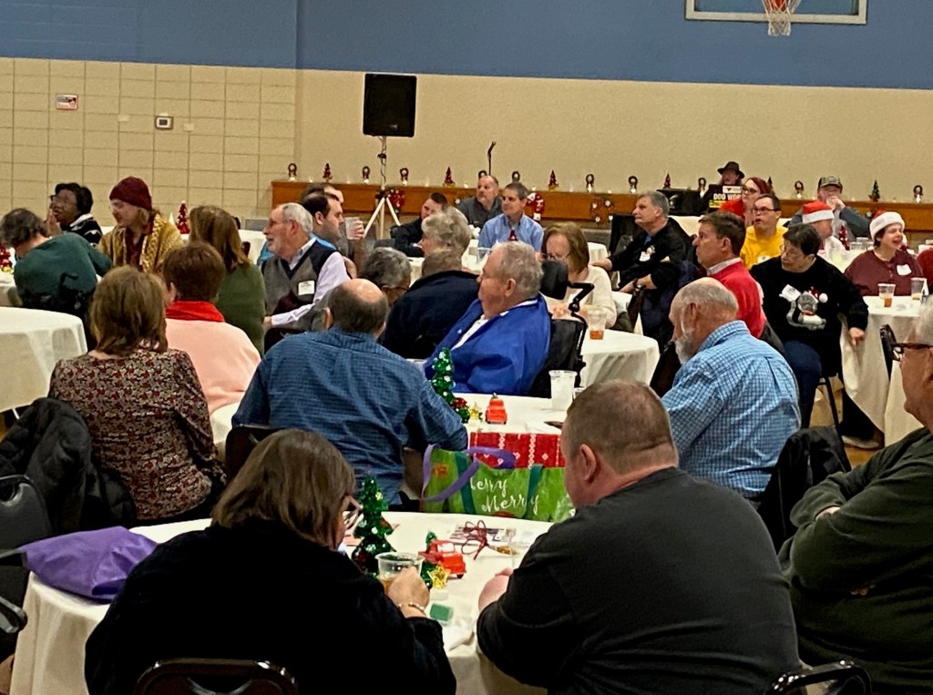 Over 100 people enjoyed the Faith Club Christmas Party this year! Prayers and Christmas carols were led by Santa himself (Jeff Wright)! Everyone shared a delicious dinner catered by Huber’s, and then danced the night away. One of our Faith Club members (Joey) even made gifts for everyone! This is a yearly tradition for him and reminds us of Jesus’ unconditional love for us. We currently have Faith Clubs for our adults with disabilities meeting at Ascension, Our Lady of Lourdes, Flaget, St. Francis of Assisi, and St. Thomas in Bardstown. The Christmas Party is one of three much-anticipated events we sponsor to bring everyone together! Please contact us if you have a potential member or if you would like to get involved. We love our Faith Club members and leaders!